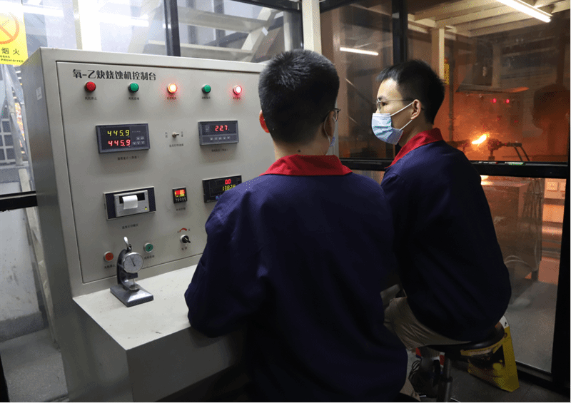 胡逗(右一)在對燒蝕防熱涂層材料進行超高溫考核試驗