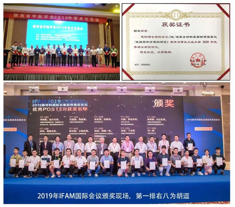 “夫盡小者大,積微成著”。在研二接近尾聲時,胡逗成功發表了第一篇陶瓷領域國際頂刊論文,并榮獲陜西宇航學會2019年學術交流會優秀分會論文、2019新材料國際發展趨勢高層論壇優秀Poster等榮譽。研三結束后,他的畢業論文成功獲評學校優秀碩士學位論文。
