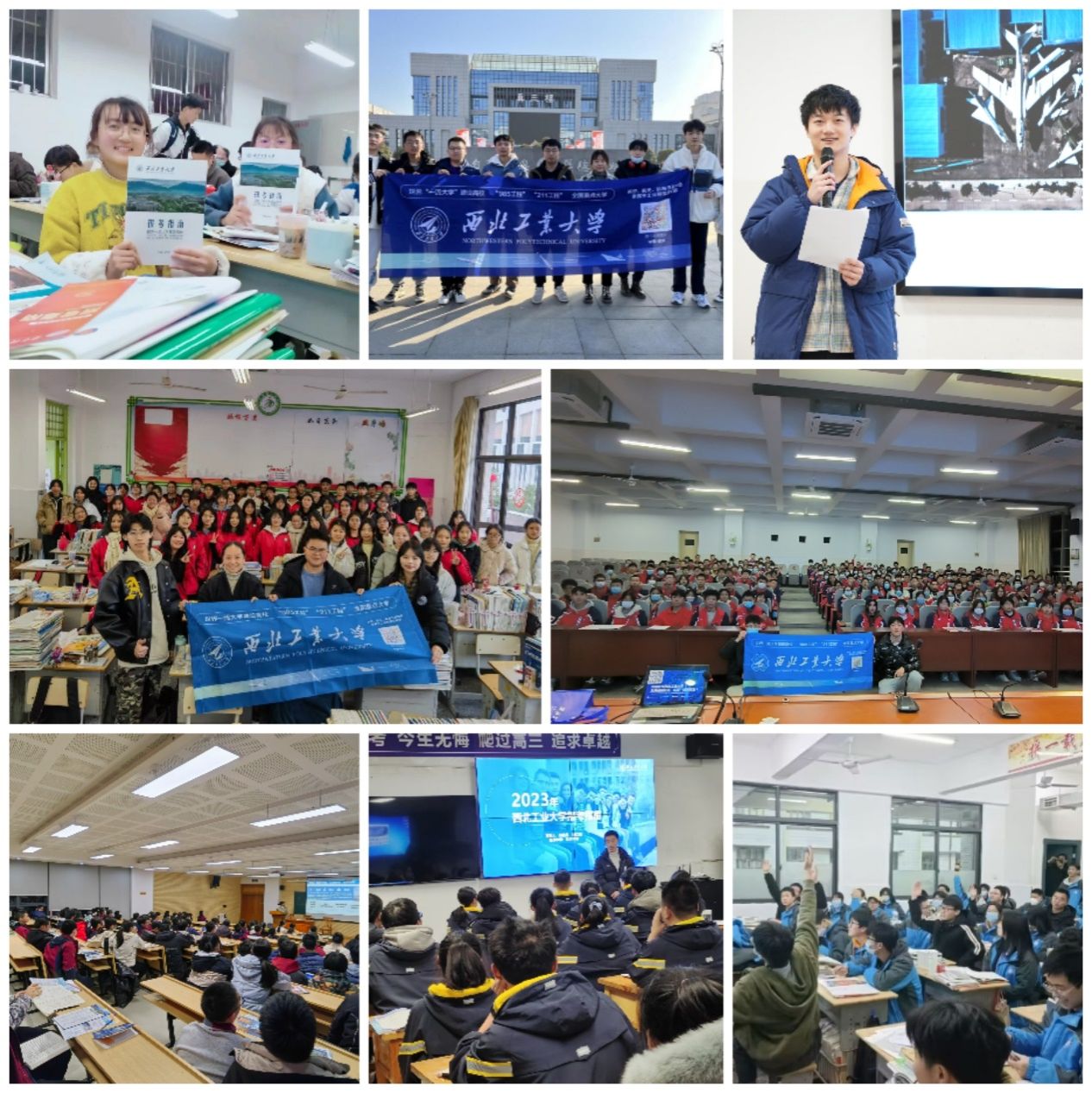 2023年,共計3100余名在校學生報名加入“學生大使”隊伍,生源學校覆蓋全國900余所中學,參與人數與覆蓋中學均創歷年新高。寒假期間,“學生大使”們回到母校,通過線下宣講、新媒體直播、短視頻制作、分發宣傳材料、面對面訪談等形式,用親身經歷向學弟學妹們講述西工大故事,充分展示介紹了學校的辦學特色、人才培養、專業設置、杰出校友、特色“王牌班”、衣食住行等情況。