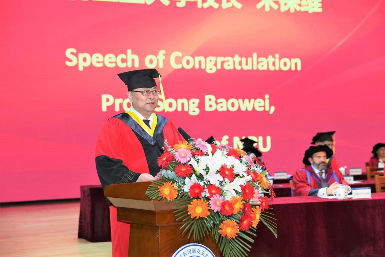 西北工業大學校長宋保維教授向圓滿完成本科階段學習的同學們表示誠摯的祝賀和美好的祝愿。他表示,當下世界百年變局正在加速演進,同學們既是見證者,又是關聯者。四年來,大家秉持“公誠勇毅”的校訓和“三實一新”的校風,克服了疫情帶來的跨境學習壓力,見證了中國共產黨成立一百周年和黨的二十大勝利召開。臨別之際,他向同學們提出了四點期望:一是希望同學們堅定信念,敢于擔當,不斷厚植家國情懷;二是希望同學們勤學苦讀,勇毅進取,不斷增強學習能動力;三是希望同學們開拓創新,攻堅克難,不斷提升創新創造力;四是希望同學們放眼世界,打開格局,持續提升全球勝任力。最后,他衷心祝愿同學們在前進的道路上披荊斬棘,大展宏圖,為國家富強和社會進步奉獻青春力量!