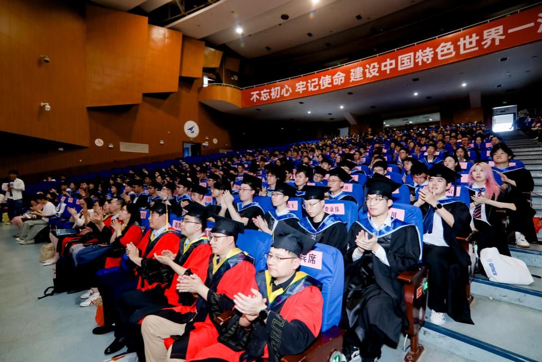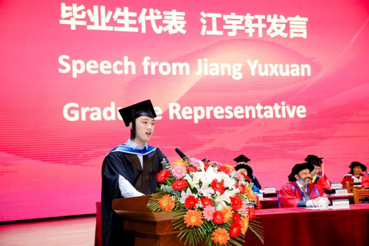 江宇軒同學作為畢業生代表發言。首先,他代表全體畢業生向母校、師長、家人和朋友致以感謝,回顧了四年來在學院的學習及生活經歷。他表示,學院國際化的教育教學模式和師長、朋輩間的鼓勵與關懷,讓同學們從最初懵懂茫然的新生成長為如今獨立自信、勇于擔當的時代青年。通過參與社會實踐、創新創業等活動,同學們不斷突破自我,跳出舒適圈,不僅在學業上取得了優異的成績,更是成長為具有綜合實力的國際化人才。