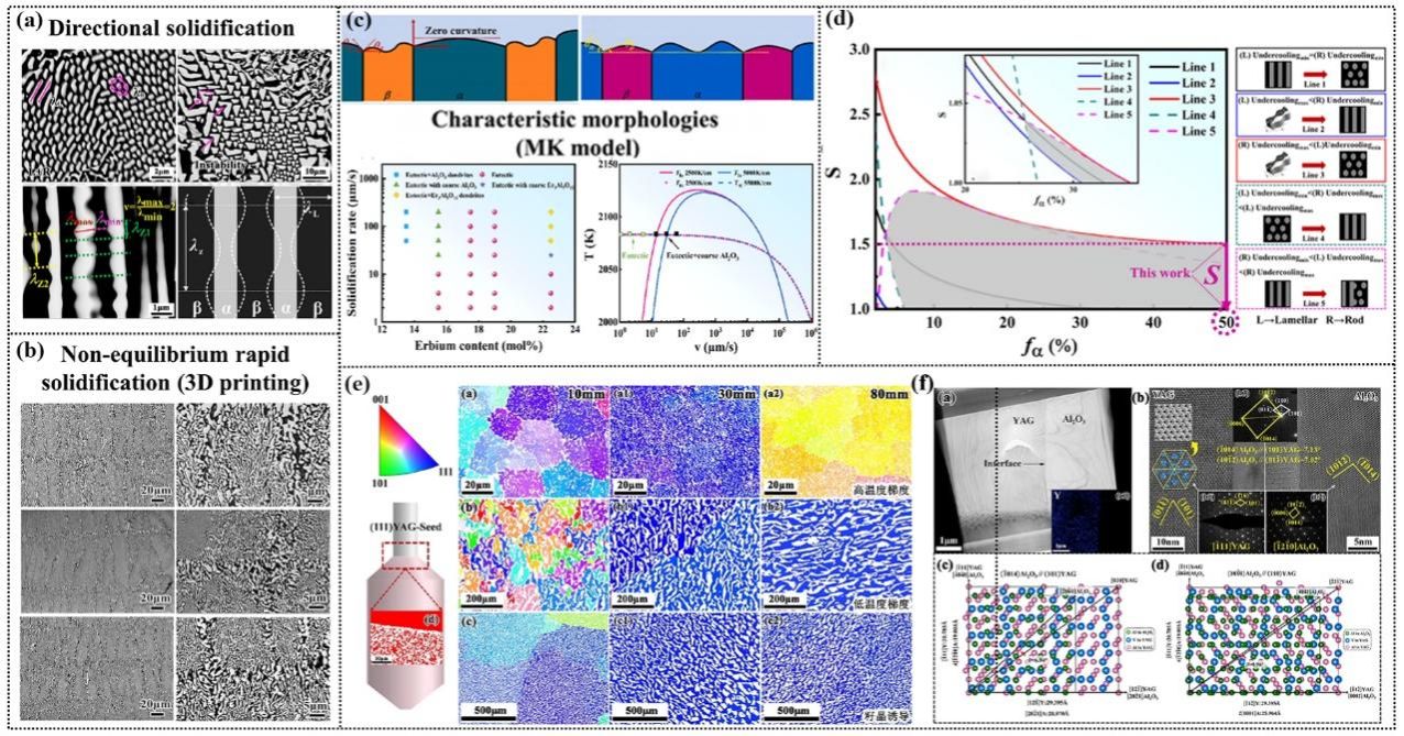 圖2(a)高熔化熵氧化物共晶陶瓷定向凝固組織形態(tài)轉(zhuǎn)變及規(guī)則化特征,(b)3D打印非平衡快速凝固組織特征;(c)共晶共生區(qū)預測和實驗結果驗證;(d)層片-棒狀組織規(guī)則化轉(zhuǎn)變和共存區(qū)預測,(e)籽晶誘導下共晶晶體學取向競爭演變,(f)不同相界面關系下界面錯配模擬和計算