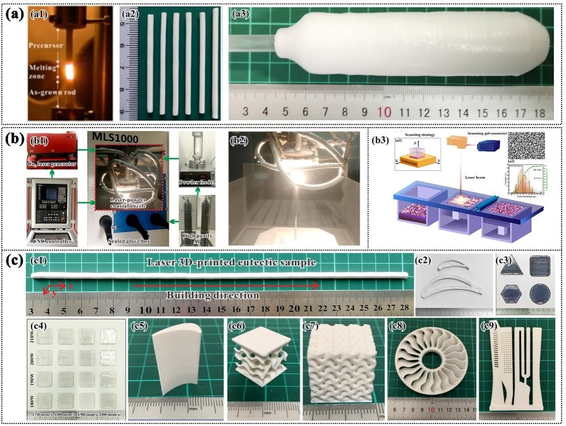 圖1 (a)氧化物共晶陶瓷高梯度定向凝固方法:(a1)超高溫度梯度激光懸浮技術;(a2)激光懸浮區(qū)熔共晶陶瓷試棒;(a3)定向凝固大尺寸共晶陶瓷;(b)激光3D打印成形設備:(b1-b2)激光直接定向能量沉積設備及打印過程;(b3)激光粉末床熔融設備示意圖,(c)激光3D打印成形試樣(c1-c4)及基于光固化3D打印的復雜構件(c5-c9)
