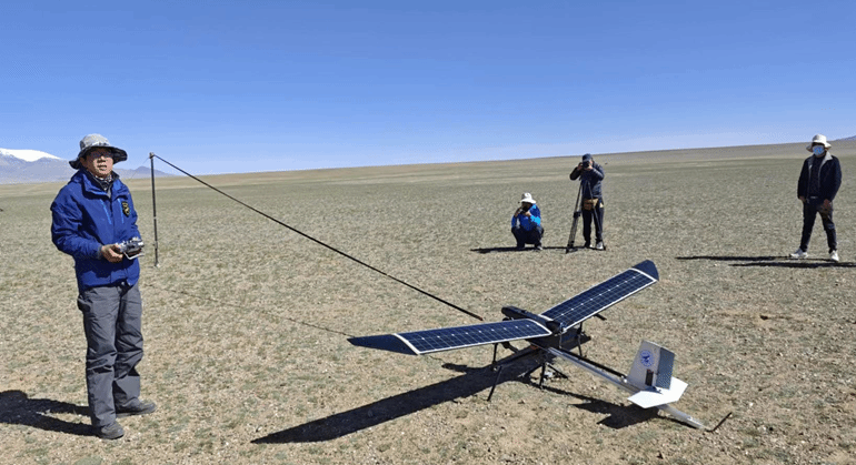 本次使用的“魅影?燕”太陽能無人機起飛重量3.8kg,翼展3.3m,最大航時12h,最大巡航高度6000m,專門針對高原生態調查需求進行優化設計,可搭載光電、紅外等多種相機,滿足高原生態監測需求。于此同時,“魅影?燕”無人機結合當前“云”傳輸技術,能夠將實時畫面同步至云端,使遠在西安的異地專家可以通過互聯網參與至科考任務中。