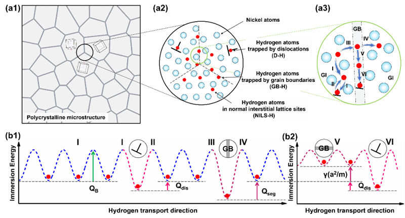 西工大新聞網9月24日電(唐斌) 為助力實現碳達峰、碳中和目標,深入推進能源生產和消費革命,氫能逐步成為全球能源轉型發展的重要載體之一。我國發改委及國家能源局發布了《氫能產業發展中長期規劃(2021-2035)》,期望于2035年形成氫產業體系。然而氫原子會降低暴露于其中的金屬構件的力學性能及服役壽命,進而限制著氫儲運以及氫能的廣泛應用,這種現象被稱為氫脆(HE)。由于氫原子非常小,采用常規實驗手段研究氫分布以及氫與材料各種微觀結構的交互作用受著嚴重的制約。晶體塑性有限元方法(CPFEM)具有可以方便預測材料微觀組織與氫擴散行為的獨到優勢,是研究氫環境下多晶合金內部不均勻變形、損傷累積及斷裂等行為的有效手段。因此,建立合適的耦合氫擴散的晶體塑性本構模型研究多晶合金的氫擴散行為,并結合相場斷裂模型預測斷裂過程,是實現抗氫脆合金組織設計與性能預測的關鍵問題。