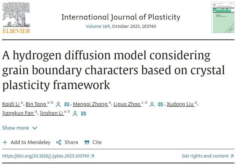 相關研究以“A hydrogen diffusion model considering grain boundary characters based on crystal plasticity framework”為題發表在塑性領域國際頂級期刊International Journal of Plasticity (DOI: 10.1016/j.ijplas.2023.103740)。該論文通訊作者為凝固技術國家重點實驗室李金山教授,唐斌教授,南京航空航天大學趙利果教授,第一作者為博士研究生李凱迪。該工作獲得國家科技重大專項(J2019-VI-0023-0140)以及國家重點研發計劃(2021YFB3702604)的資助和支持。