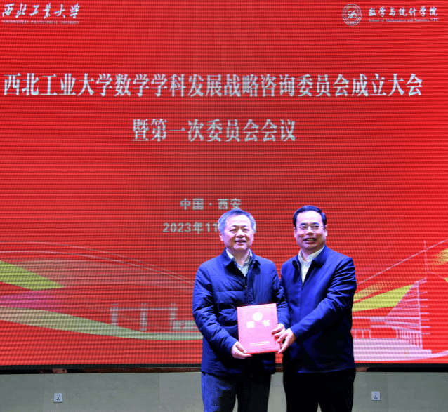 我校發(fā)展規(guī)劃處副處長佘磊磊宣讀了《西北工業(yè)大學(xué)數(shù)學(xué)學(xué)科發(fā)展戰(zhàn)略咨詢委員會(huì)委員名單》。程基偉副書記向委員會(huì)主任委員鄭志明院士以及24位專家頒發(fā)了聘書。