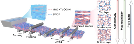 通過調(diào)控主體材料各層級中羧基化多壁碳納米管與針葉木纖維的比例,實現(xiàn)了電導(dǎo)率、親鎂性和孔徑在垂直方向上的梯度分布。同時,低成本的針葉木纖維和羧基化多壁碳納米管以及可批量化生產(chǎn)的造紙工藝為柔性電極的實際生產(chǎn)和應(yīng)用奠定了基礎(chǔ)。
