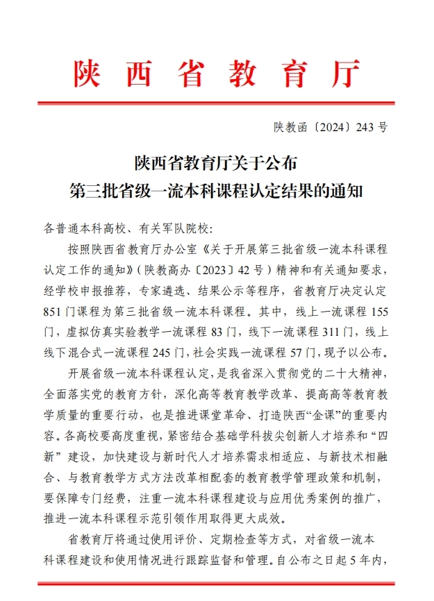 近日,陜西省教育廳公布了第三批省級一流本科課程認定結果,我校共39門課程獲批省級一流本科課程,并列陜西省高校第一。