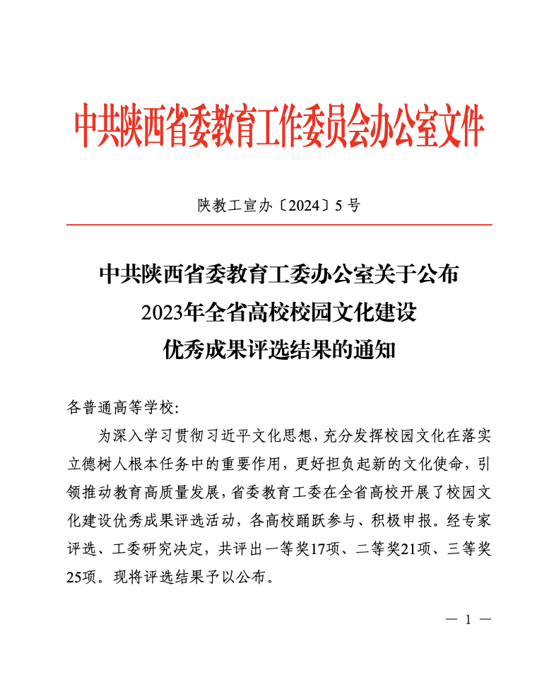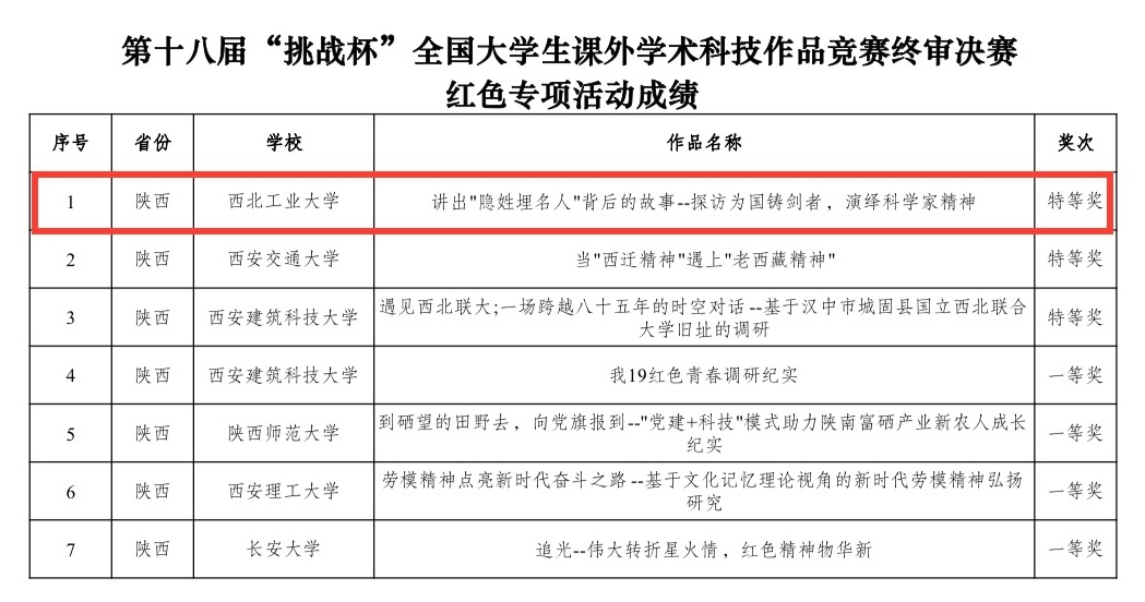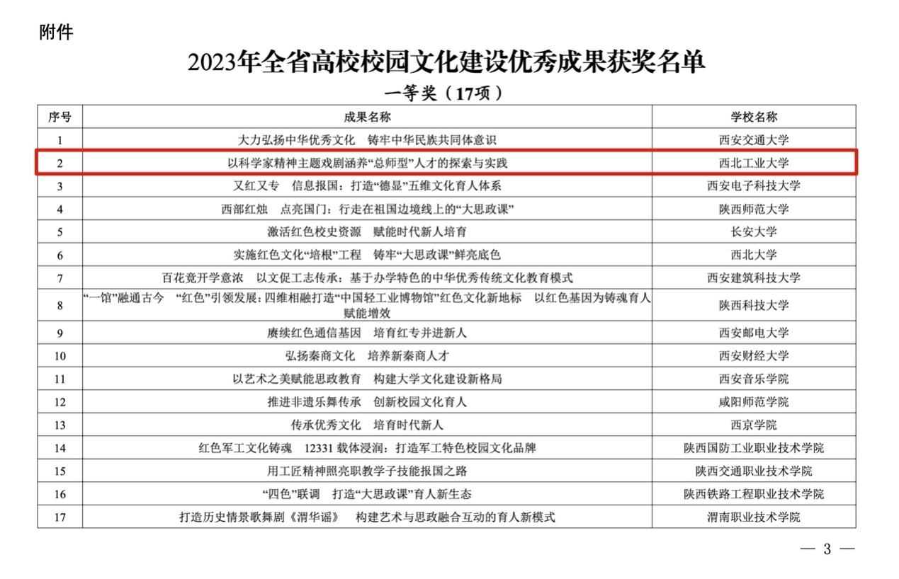 3月13日,經(jīng)中共陜西省委教育工作委員會評選,2023年全省高校校園文化建設優(yōu)秀成果獲獎名單揭曉(陜教工宣辦〔2024〕5號),西北工業(yè)大學申報的《以科學家精神主題戲劇涵養(yǎng)“總師型”人才的探索與實踐》榮獲一等獎。