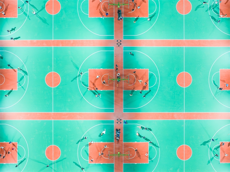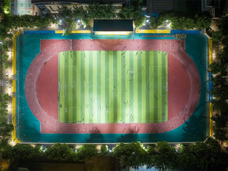 施工過程中,現(xiàn)場靠尺、水準儀全程測量,隨測隨鋪,完成平整度驗收合格后方可進行下一區(qū)域鋪設。跑道面層鋪設的平整度誤差不大于3mm,標準跑道的縱向坡度(跑進方向)不大于0.1%,橫向坡度(由外沿向內沿,垂直于跑進方向)不大于1%,跑道面層顏色均勻一致,無色差。跑道面層的物理機械性能與有害物質,均通過中國田徑協(xié)會田徑場地人工合成面層實驗室檢測,檢測結果符合國標體育場地使用要求。