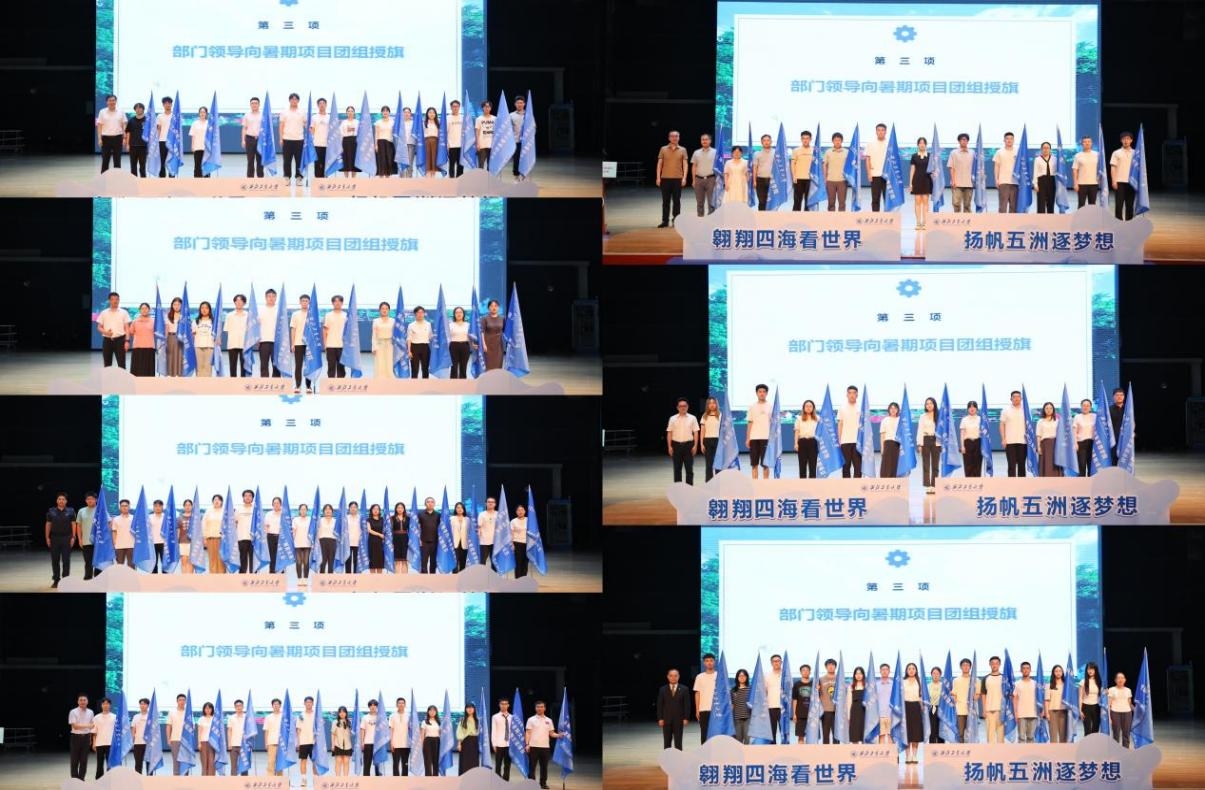 他分別為黨委學(xué)工部、航空學(xué)院、微電子學(xué)院、數(shù)學(xué)與統(tǒng)計學(xué)院、教育實驗學(xué)院、體育部、外國語學(xué)院負(fù)責(zé)人授予2024年“翱翔四海”七大主題旗幟。各部門負(fù)責(zé)同志為暑期項目團隊代表授予項目團旗。