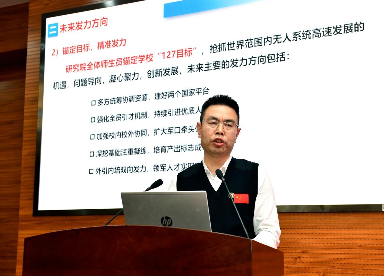 航海學院院長潘光、無人系統技術研究院副院長符文星、管理學院副院長賈明依次作科研工作經驗交流匯報。